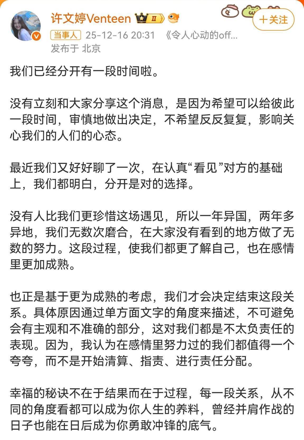 毛人龙与许文婷这对因恋爱综艺结缘、相爱四年的“人文CP”,于2025年12月16日同步发布长文宣布分手,结束四年恋情,两人强调分手是审慎沟通后的共同决定,无原则性矛盾或狗血冲突。分手核心原因,异地压力与成长分化长期异地消耗情感联结。时间跨度,四年恋情中经历一年异国恋,许文婷留学加拿大及两年多异地恋,实际见面机会极少。毛人龙曾公开坦言“不见面真的很难熬”,但双方均未为团聚调整职业规划,导致情感逐渐淡化。现实困境:异地矛盾具体表现为“感冒时无人递药,委屈时难求拥抱”,日常陪伴缺失持续消磨爱意,最终在第四个纪念日前选择体面结束关系。事业轨迹与价值观分化。许文婷通过职场综艺《令人心动的offer第五季》跻身红圈所律师,并跨界演艺圈,公众曝光度和事业重心显著变化。
