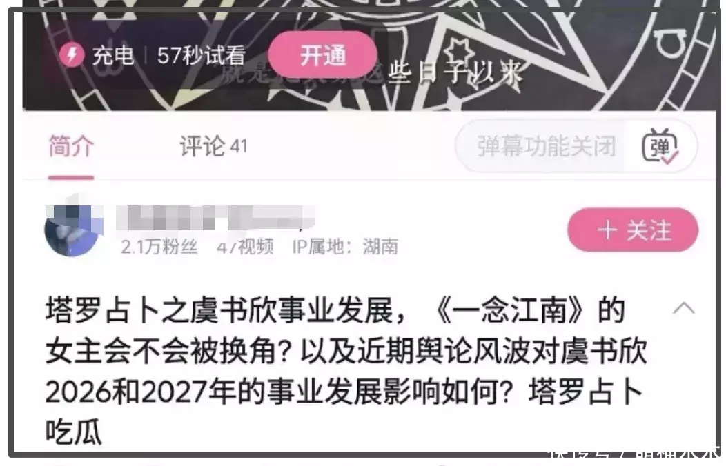 据悉,该up主用塔罗牌分析了一下虞书欣的事业发展,具体涉及到《一念江南》会不会被换角色,近期舆论对虞书欣2026年和2027年的事业发展到底有没有影响。要知道塔罗牌这种东西其实就是图一乐呵,娱乐消遣为主,但是没想到虞书欣竟然真的信这个,还特意充钱解锁充电视频。