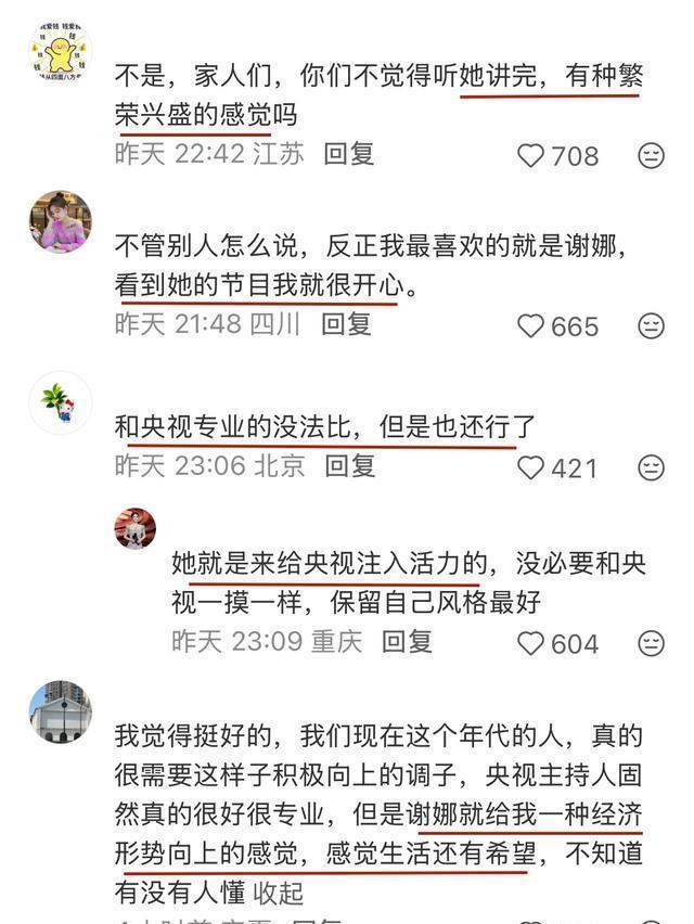 一开场,谢娜就时刻保持 紧绷 。 眼睛瞪得像 铜铃 ,用 四川话 跟观众打招呼。 看得出用尽了全力,笑容使劲绽放,说话 抑扬顿挫 ,马尾甩得飞起。 那种“老熟人”装一本正经的感觉,又回来了。 对比一下同场的 蓝羽 ,大气松弛,台风很稳。 有种 举重若轻 的温柔,毫不费力地吸引观众的注意力,极具 亲和力 的暖场范本。 没拿手卡,几乎不看提词器,全程笑容甜美,表情管理十级。 央视主持的专业杀伤力,轻松将地方台的大花秒杀于无形。 谢娜是肉眼可见的 紧张 。 蓝羽的话还没说完,她就已经举起话筒准备发言,一不小心差点抢话。 发现还没轮到自己,她又赶紧放下话筒,一边鼓掌掩饰 尴尬 ,一边盯着提词器,确认自己接下来要说什么。 这一晚,谢娜的 高光 时刻,是和黄子弘凡合唱了张杰的《勿忘心安》。 合唱前,听到老公的歌,娇羞地跺脚捂脸; 合唱时,没有技巧,全是感情。 当场面变得热烈时,谢娜的“ 综艺人格 ”总会不经意地跑出来。 搭着蓝羽的肩大笑,兴奋地甩着头发,这才是隐藏在“端庄”包装下真实的她。 这时候,她才真正做回了自己。 对于谢娜这一晚的表现,评论区各抒己见。 粉丝夹道欢呼,宣布谢娜 转型升级 成功,“她就是来注入 活力 的”。 支持她的网友觉得,她的开心热闹,能给人带来一种繁荣兴盛的感觉。