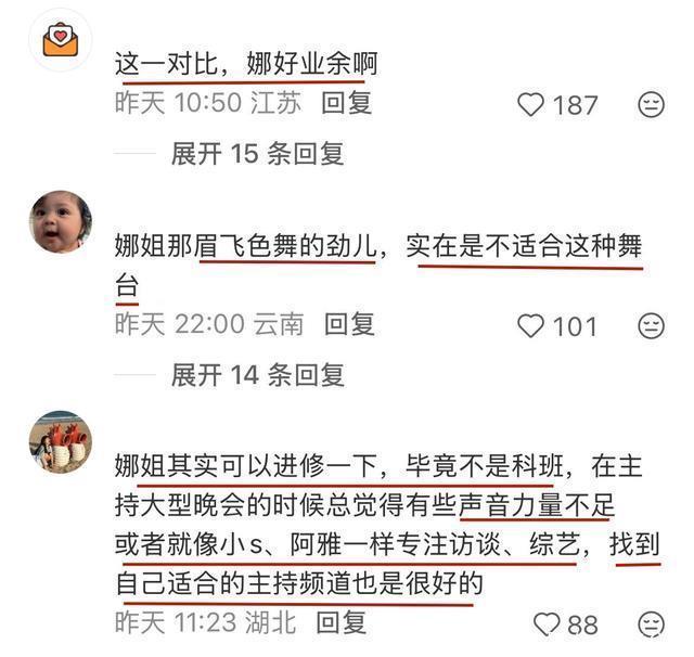 不看好的网友则觉得,综艺主持人的身份显然更适合她,强行向大型盛典主持跨越,看着还是有点 吃力 。 有网友建议谢娜可以去 进修 一下,或者专注访谈、综艺,找到适合自己的主持频道。