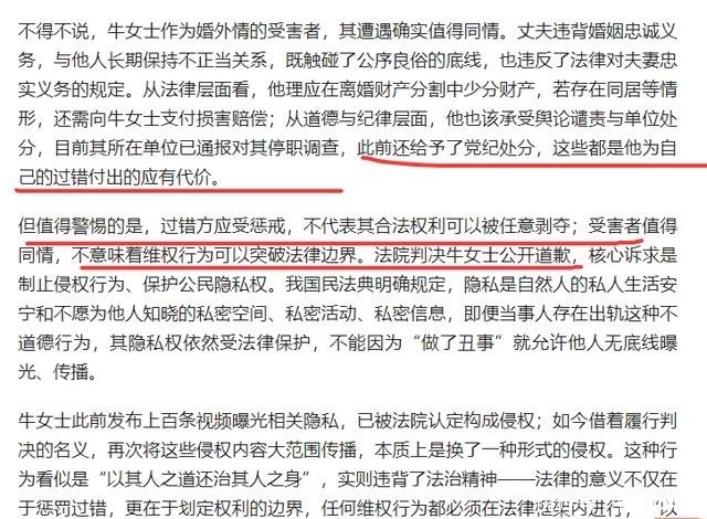 有媒体发文指出,牛娜作为婚外情的受害者,她的遭遇确实值得同情,但是值得警惕的是,过错方应该受到惩戒,不代表其合法权利可以被任意剥夺。