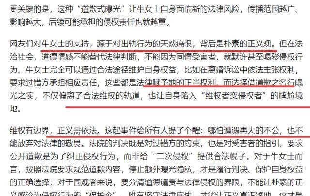 文章还提到,这种道歉式曝光让牛娜自身面临新的法律风险,传播范围越广、影响越大,后续可能承担的侵权责任也就越重。